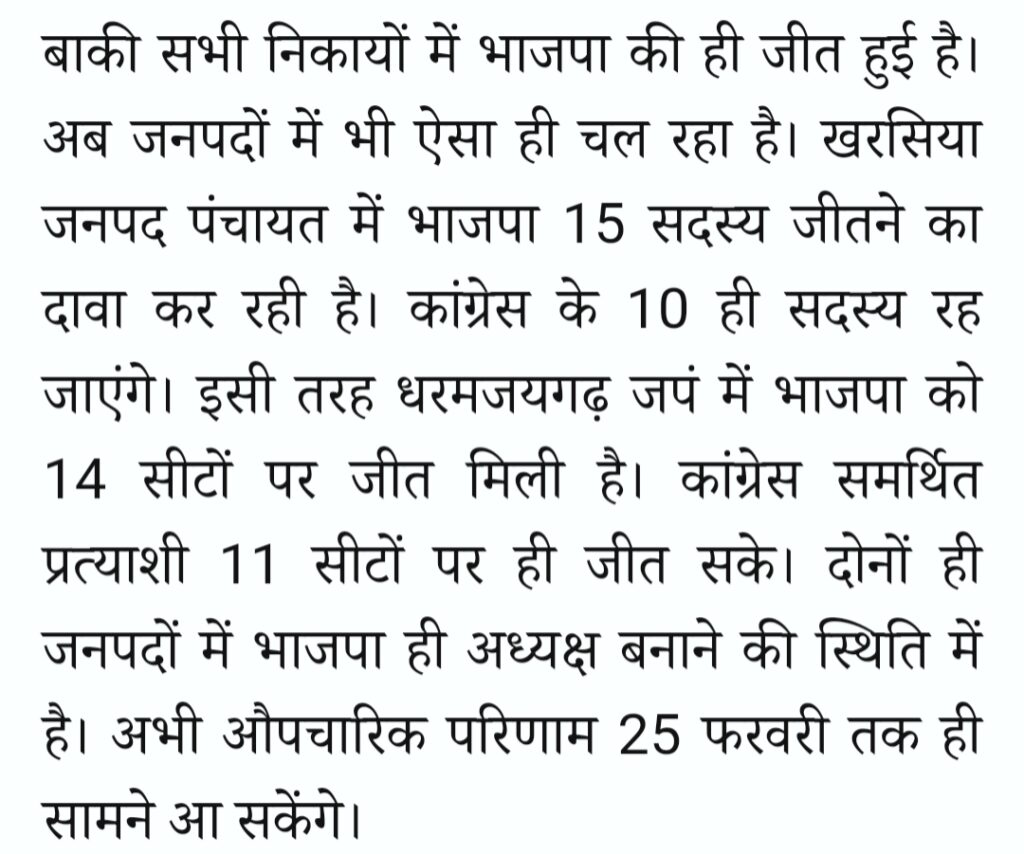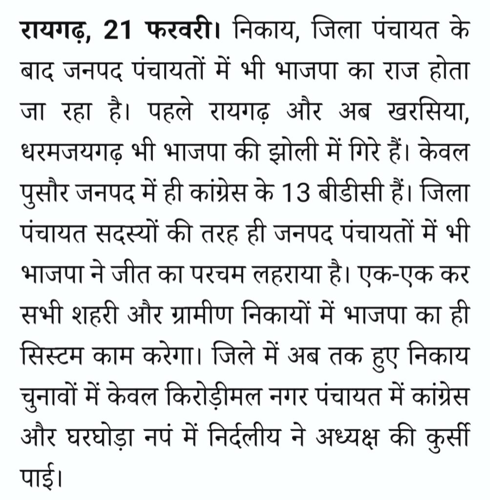 खरसिया और धरमजयगढ़ की जनपद में भी भाजपा। बहुमत से चुकी कांग्रेस। केवल पुसौर ही है हाथ में।