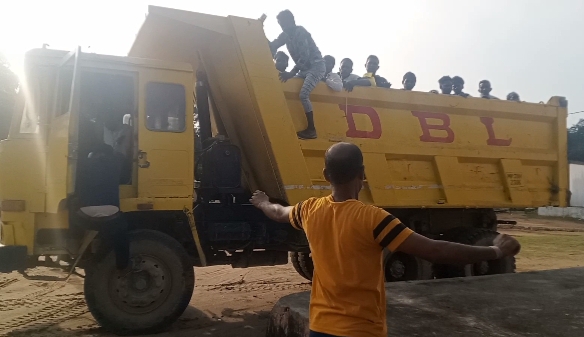 धरमजयगढ़ में यातायात नियमों का उल्लघंन/डी बी एल कंपनी के हायवा में सवारी।