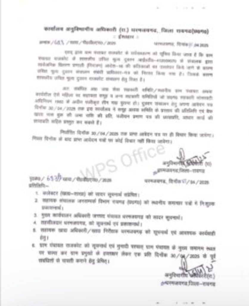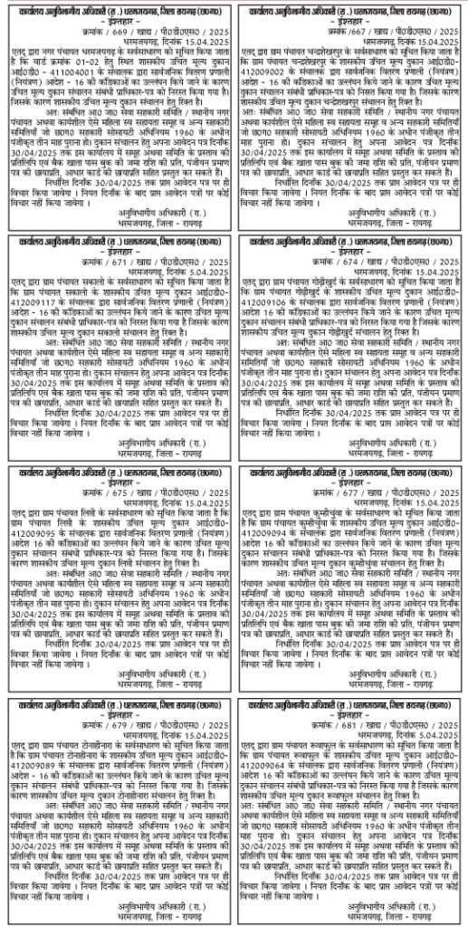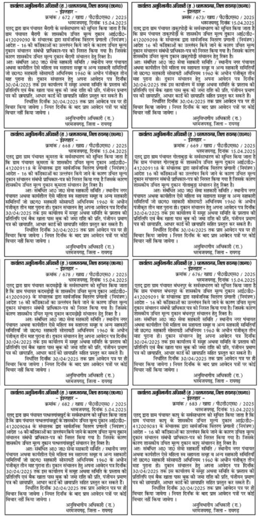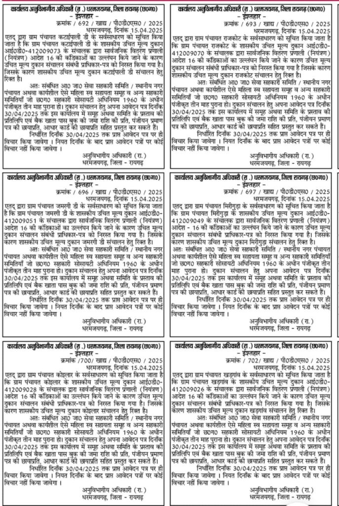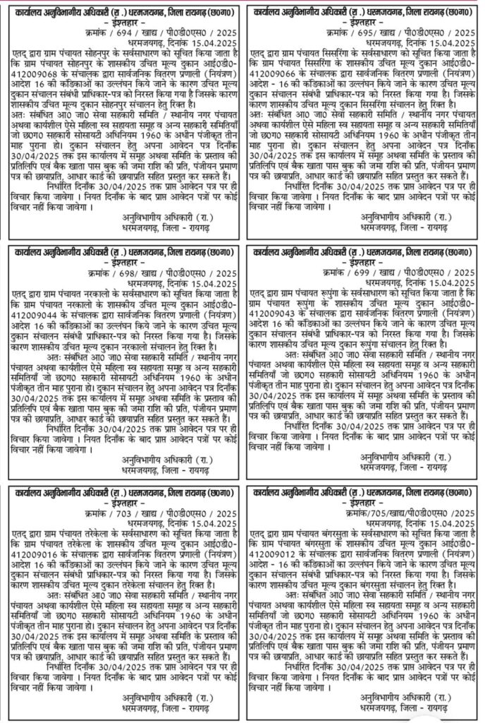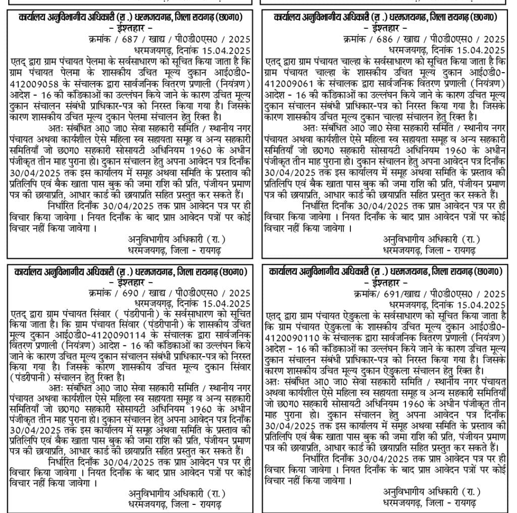 जिसका धरमजयगढ़ राजस्व विभाग द्वारा इस्तिहार जारी किया गया है जिसमें गांव के राशन दुकान संचालन के लिए आवेदन मांगे गए हैं उन्हें 30 अप्रैल तक आवेदन जमा करने के लिए कहा गया है सूची में