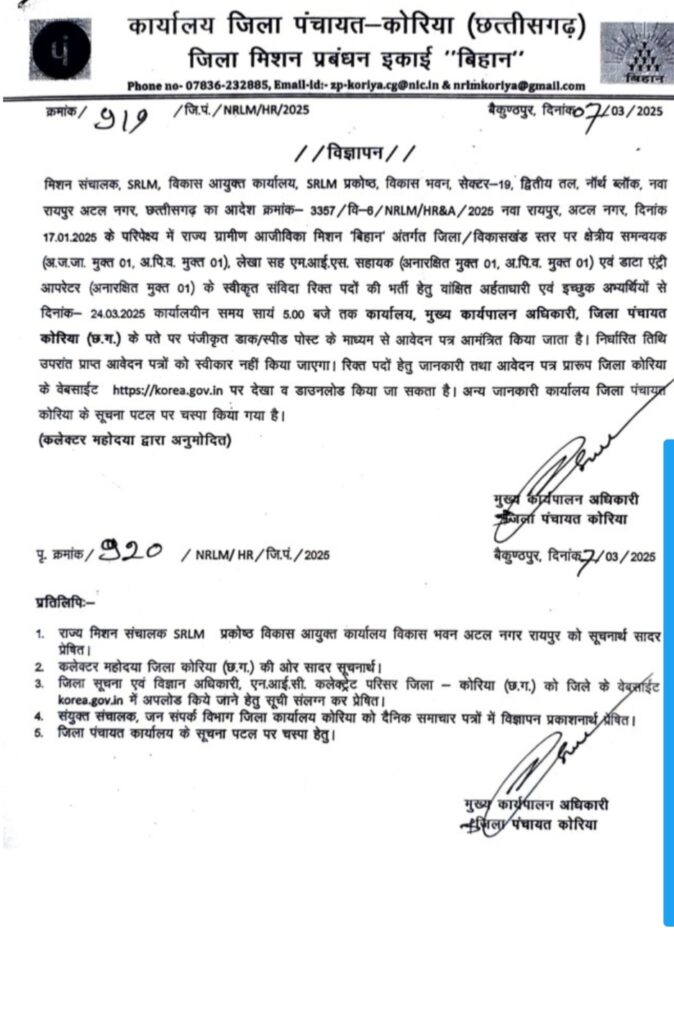 : छत्तीसगढ़ राज्य ग्रामीण आजीविका मिशन “बिहान” के अंतर्गत कोरिया जिला में लेखा सह एमआईएस सहायक के संविदा पद पर भर्ती के लिए आवेदन आमंत्रित किए गए हैं। जिसके तहत लेखा सह एम.आई.एस. सहायक और डाटा एंट्री ऑपरेटर के स्वीकृत संविदा रिक्त पदों की भर्ती दिनांक- 24.03.2025 तक आवेदन मांगे गए हैं। वहीं निर्धारित तिथि उपरांत प्राप्त आवेदन पत्रों को स्वीकार नहीं किया जाएगा। रिक्त पदों हेतु जानकारी तथा आवेदन पत्र प्रारूप जिला कोरिया के वेबसाईट https://korea.gov.in पर देखा व डाउनलोड किया जा सकता है।