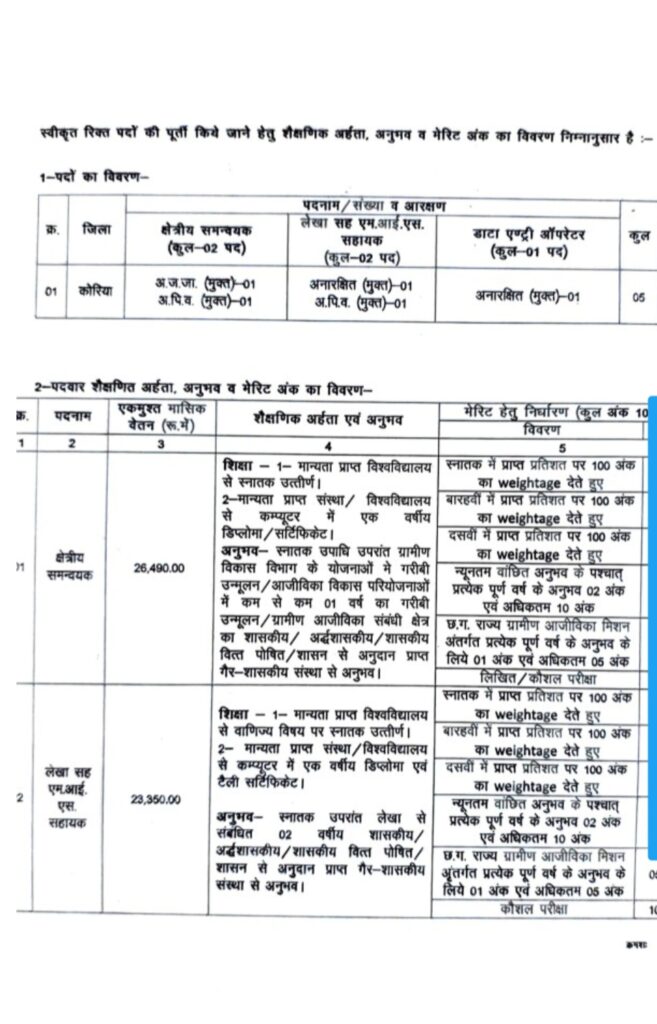राज्य ग्रामीण आजीविका मिशन “बिहान” अंतर्गत जिला / विकासखंड कार्यालय में संविदा के विभिन्न स्वीकृत रिक्त पदों की पूर्ती किये जाने हेतु शैक्षणिक अर्हता, अनुभव व मेरिट अंक का विवरण निम्नानुसार है :-1- पदों का विवरण- क्षेत्रीय समन्वयक, लेखा सह एम.आई.एस. सहायक, डाटा एंट्री ऑपरेटरकितनी मिलेगी सैलरीक्षेत्रीय समन्वयक के लिए मासिक वेतन- 26,490लेखा सह एम.आई.एस. के लिए मासिक वेतन- 23,350डाटा एंट्री ऑपरेटर के लिए मासिक वेतन- 23,350आयु सीमाआयु न्युनतम 21 वर्ष एवं अधिकतम 35 वर्ष सामान्य प्रशासन विभाग द्वारा आयु सीमा छूट के संबंध में छत्तीसगढ़ निवासियों एवं विभिन्न वर्गों के लिये समय-समय पर जारी निर्देश के अनुरूप छूट की पात्रता होगी। आयु की गणना 1 जनवरी, 2025 के आधार पर की जायेगी।शैक्षणिक योग्यताKorea Government Jobs Recruitment : इन सभी पदों में आवेदन करने वाले उम्मीदवार को किसी मान्यता प्राप्ता बोर्ड से 10वीं व 12वीं की कक्षा में पास होना जरूरी है। इसके साथ ही कम्प्यूटर में एक साल का डिप्लोमा होना चाहिए।
