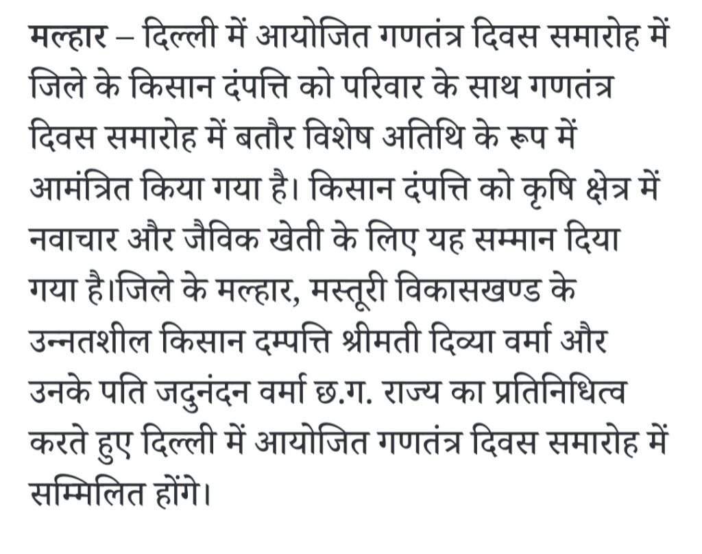 Home/Blog/बिलासपुर के किसान दम्पति को गणतंत्र दिवस पर दिल्ली से आमत्रण। Blog बिलासपुर के किसान दम्पति को गणतंत्र दिवस पर दिल्ली से आमत्रण। परितोष मंडल23 January 20250 16 Less than a minute Facebook Twitter LinkedIn Pinterest WhatsApp Telegram परितोष मंडल23 January 20250 16 Less than a minute Facebook Twitter LinkedIn Pinterest WhatsApp Telegram Share Facebook Twitter LinkedIn Pinterest WhatsApp Telegram Share via Email Print